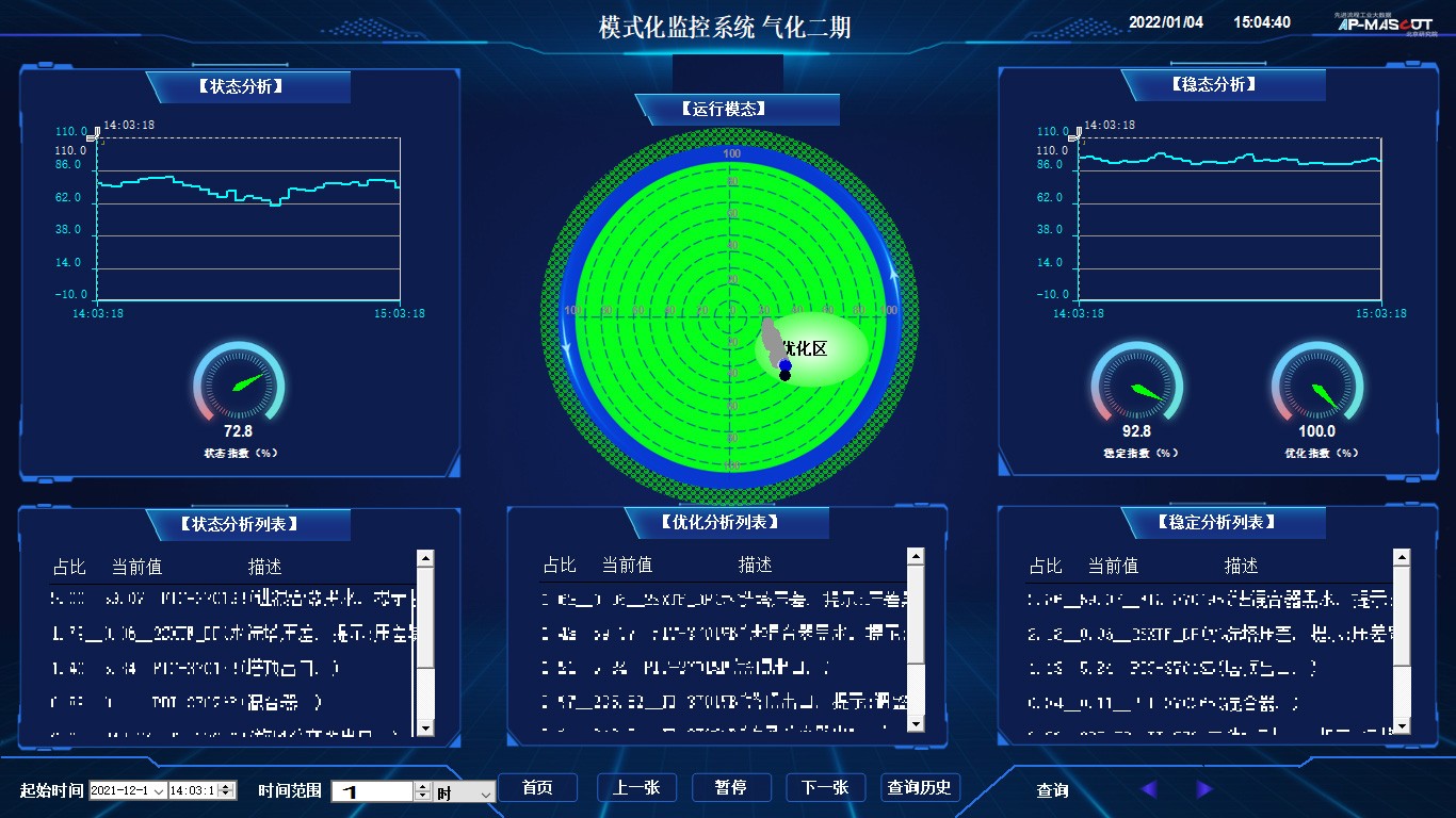 创新中心联合万华化学,针对此应用场景,共同打造了全国煤化工行业首例模式化监控大数据实时分析系统,系统基于大数据、人工智能,通过对数据源系统进行AI算法模型开发建模,通过对气化炉的实时大数据模式化监控,判断炉内实际状态,及时调整操作条件,保证生产稳定。同时,系统将传统参数监看切换到模块化图形监看,直观易懂,工作人员通盘监看状态从30分钟缩短至5分钟。并通过实时模式化监控系统,实时优化生产操作,每天可多生产约70吨有效蒸汽,每年预计节省生产蒸汽成本约315万元。